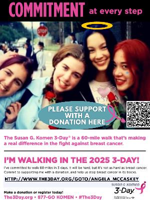 Please support me as I commit to an incredible challenge. The Susan G. Komen 3-Day is a 60-mile walk over the course of three days. It will be hard, but it’s not as hard as breast cancer. It’s not as hard as chemo. It’s not as hard as getting bad news at your latest scan. It’s not as hard as saying goodbye. And that’s why I know I have to do this. That’s why I’m walking and why I’m raising money – to end breast cancer forever.